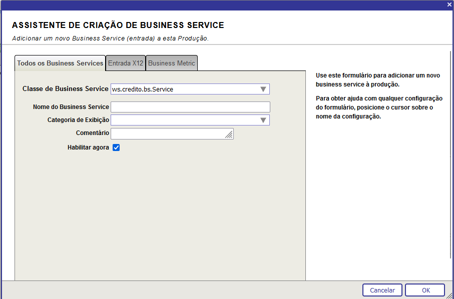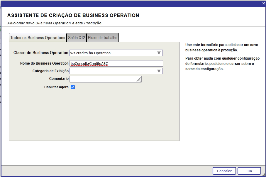 Feito o código do BO vamos coloca-lo na production. Primeiro vamos colocar o BO com o nome de boConsultaCreditoABC. Para isso clique no botão de (+) ao lado do nome Operations na nossa production e preencha a tela conforme abaixo: