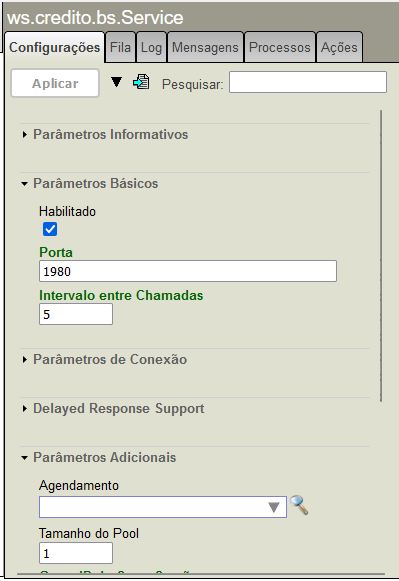 Agora volte a production e clique no nome do nosso BS (ws.credito.bs.Service) e veja a configuração dele. Expanda a área Parâmetros de Conexão e marque a caixa Habilitar Requisições Padrão conforme a tela abaixo: