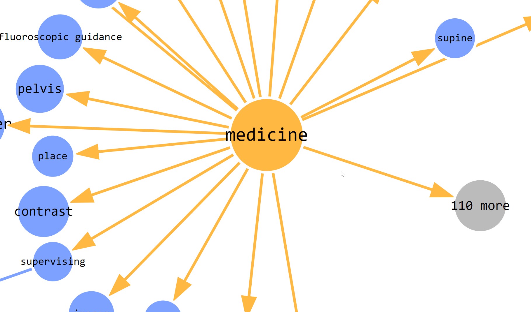 Uma vez que o conceito de seed é especificado nas configurações, o iKnow Entity Browser constrói um gráfico de conceitos semelhantes ou relacionados ao conceito de seed. Você pode brincar com este gráfico arrastando seus nós, no entanto, a força física sempre tentará organizá-lo na forma de um diagrama de floco de neve.
